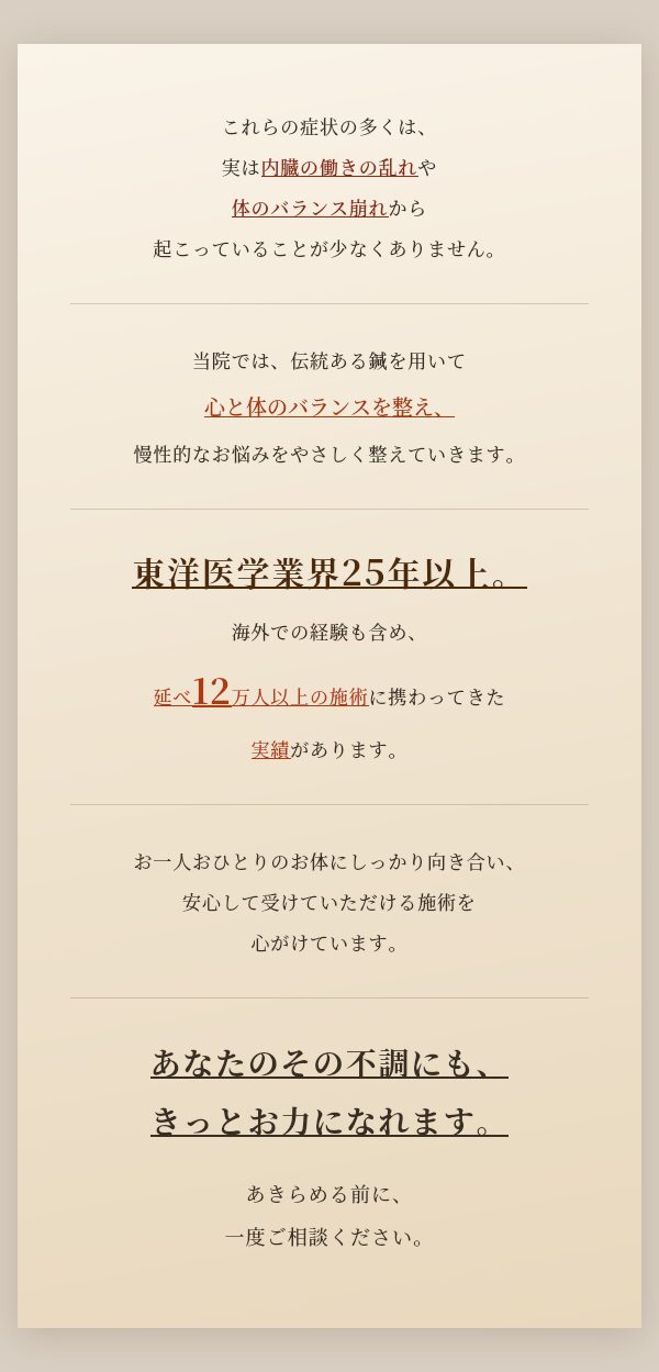 人は年齢とともにさまざまな不調が現れるのは事実です。しかしなんでもかんでも年齢のせいだけにして不調の改善を諦めるようなことはしません。本当の原因をつきとめ、できる施術をすべて全力で行う。これが当院の責任だと思っています。そして不調原因や通院に関する情報は隠すことなく、すべて誠実にあなたに包み隠さずお伝えいたします。そうすることであなたと一緒に不調の改善を目指します。